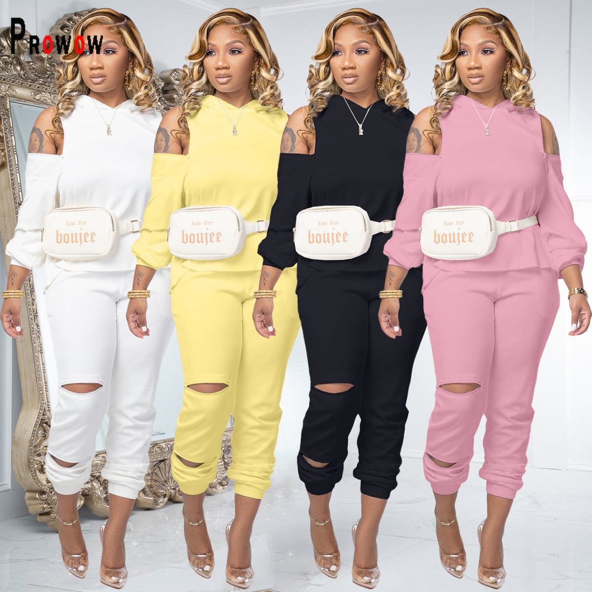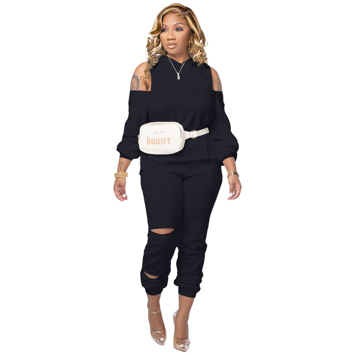 Hollow Shoulder Hooded Sweatshirt Set